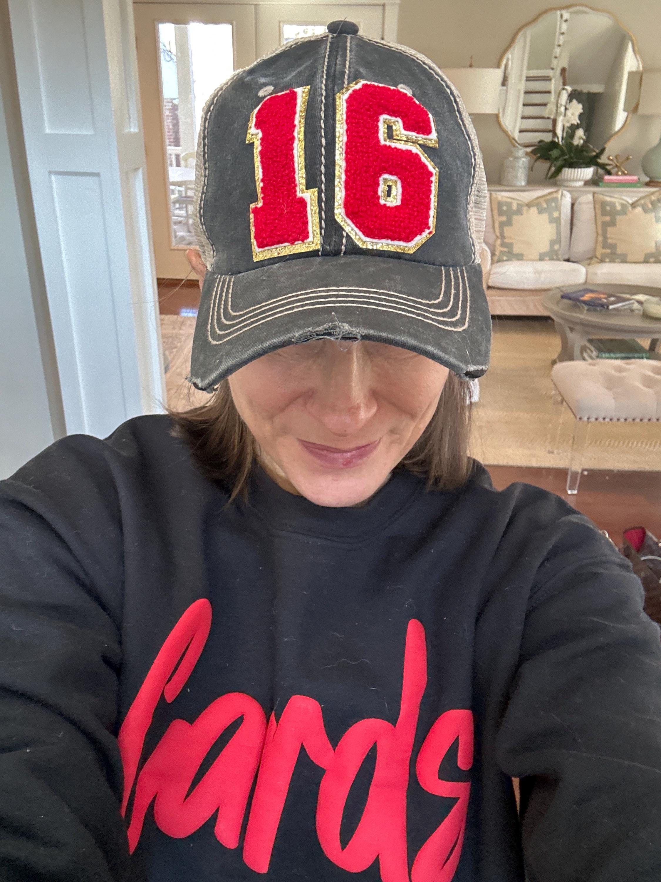 Made with high-quality materials, this hat is available in a variety of colors to match your team or personal style. Choose your preferred hat color from the dropdown menu and specify if you'd like one or two numbers on the front. The number patches come in red, black, or white with a glittered gold background, adding a touch of sparkle to your game day look. The football patch on the side completes the sporty vibe.