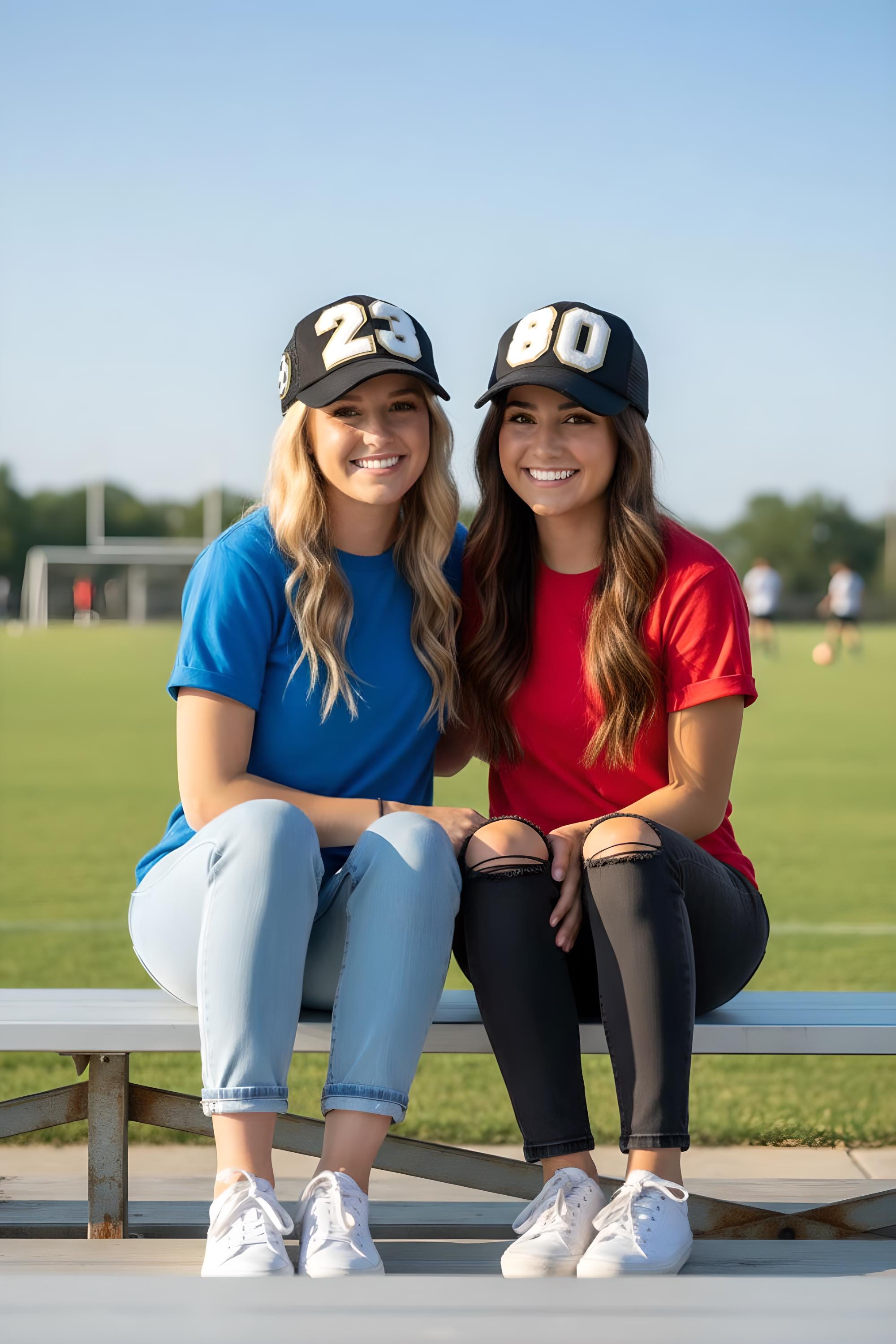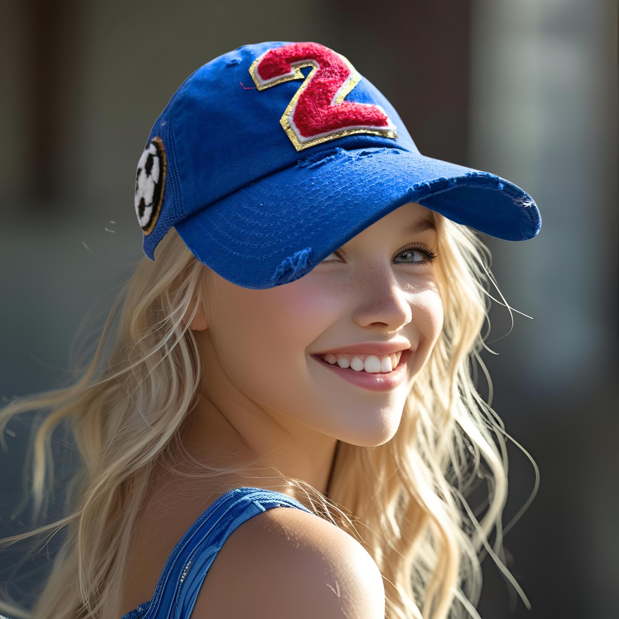 Hats come in a variety of colors and the number patches come in red, black, or white with a glittered gold background.