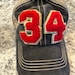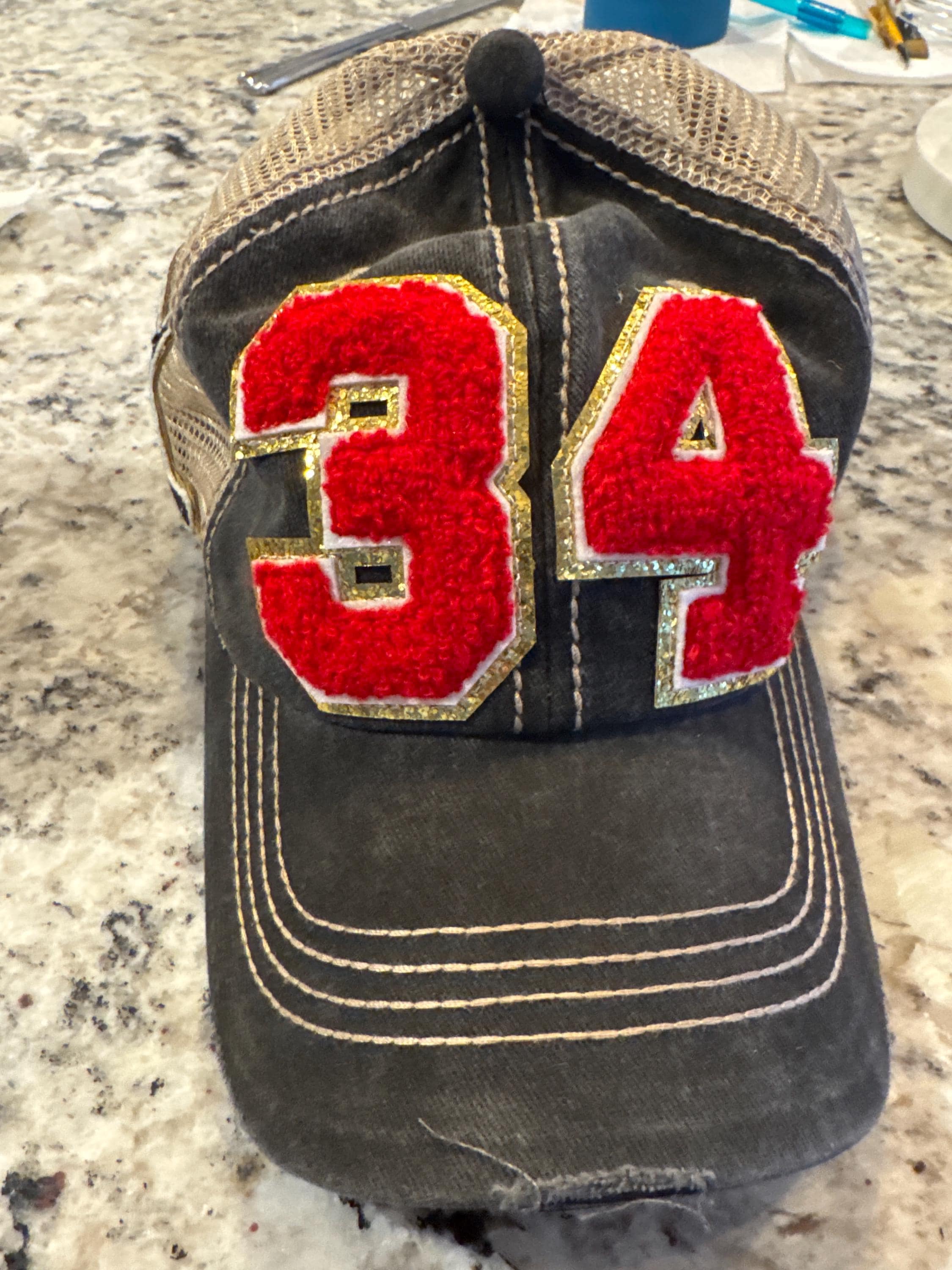Hats come in a variety of colors and the number patches come in red, black, or white with a glittered gold background.
