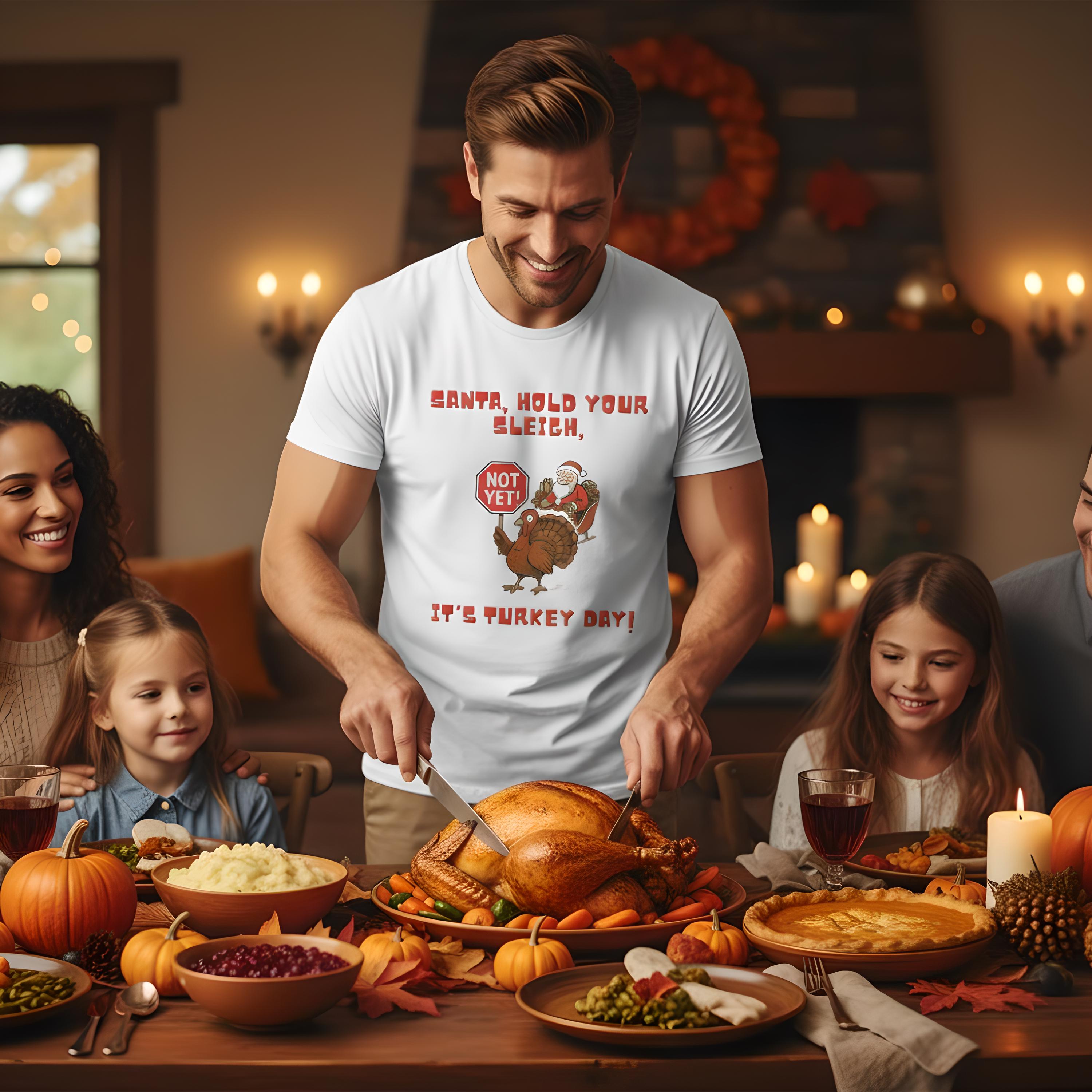 This funny Thanksgiving t-shirt with the saying 'Santa, hold your sleigh, its turkey day' is perfect for adding some humor to the holiday season. It's a great addition to your casual wardrobe and can be worn during Thanksgiving celebrations with family and friends. This unisex tee is made with 100% cotton, making it lightweight and breathable for all-day comfort.