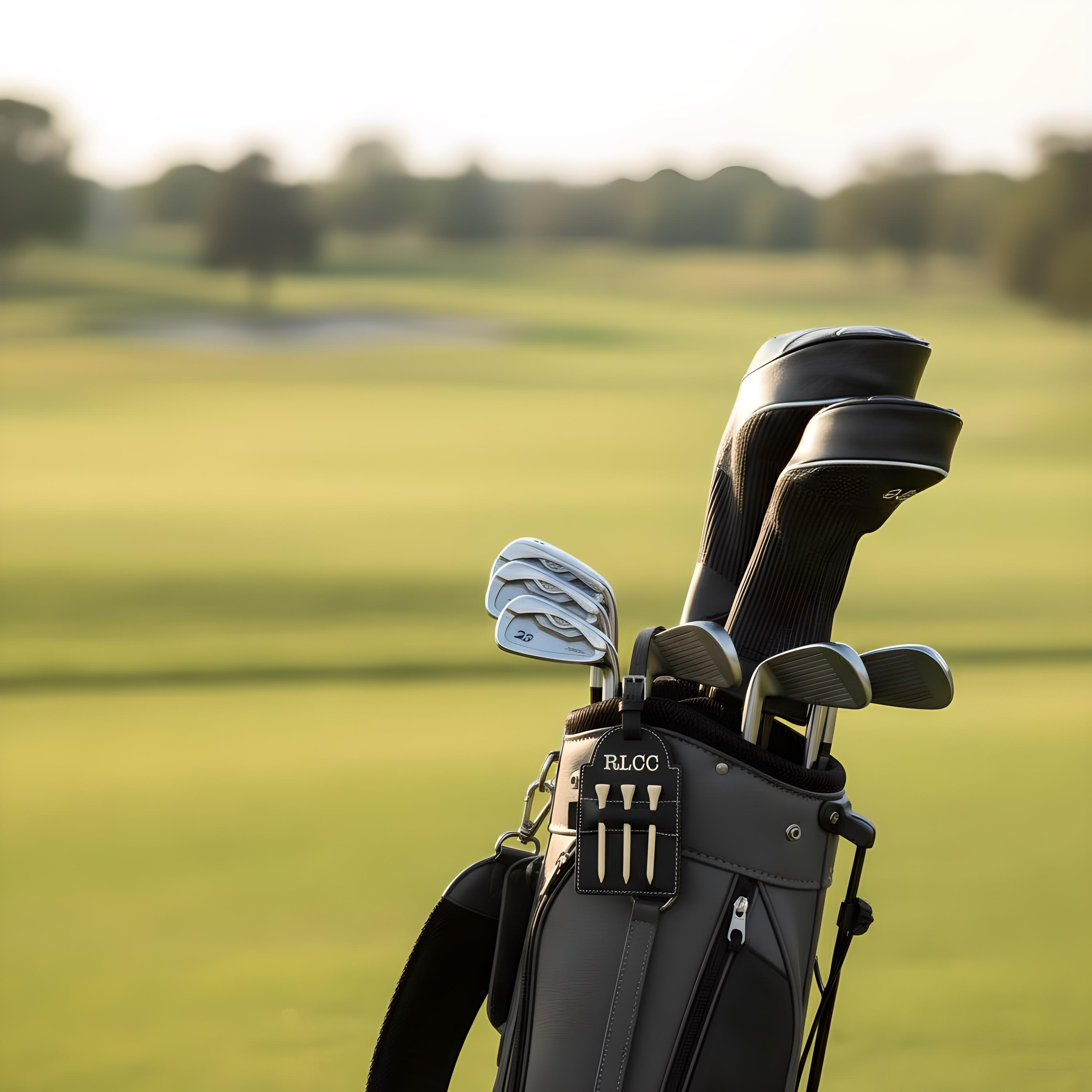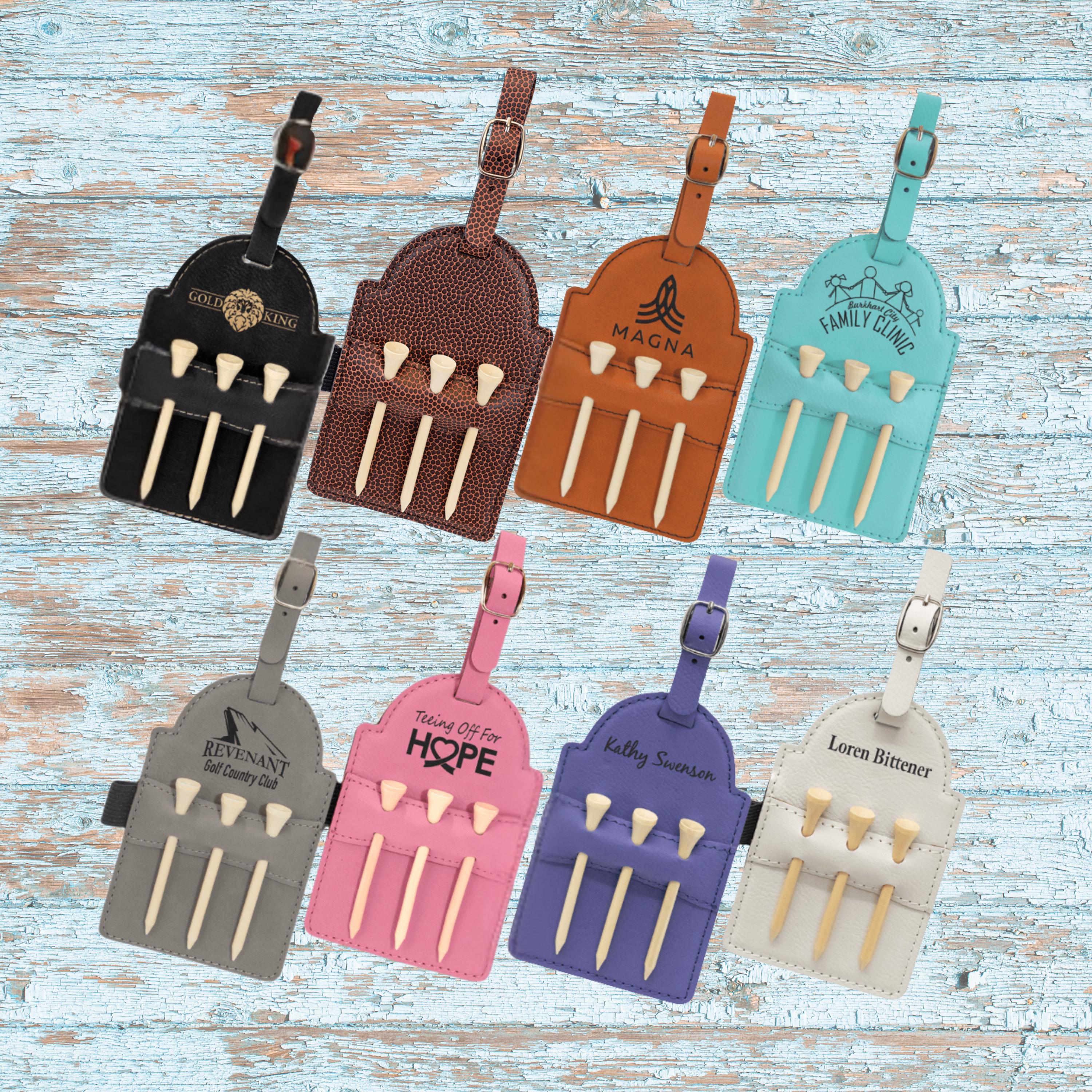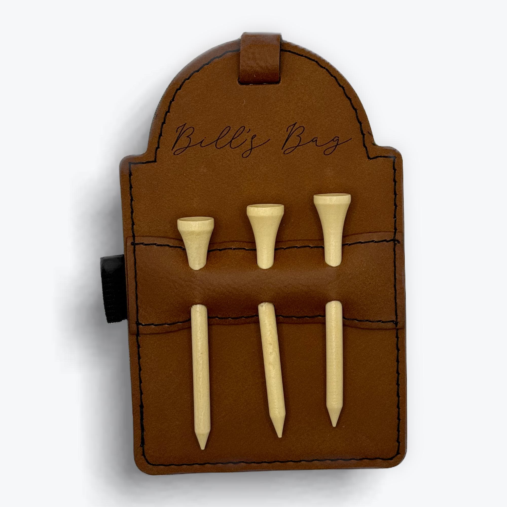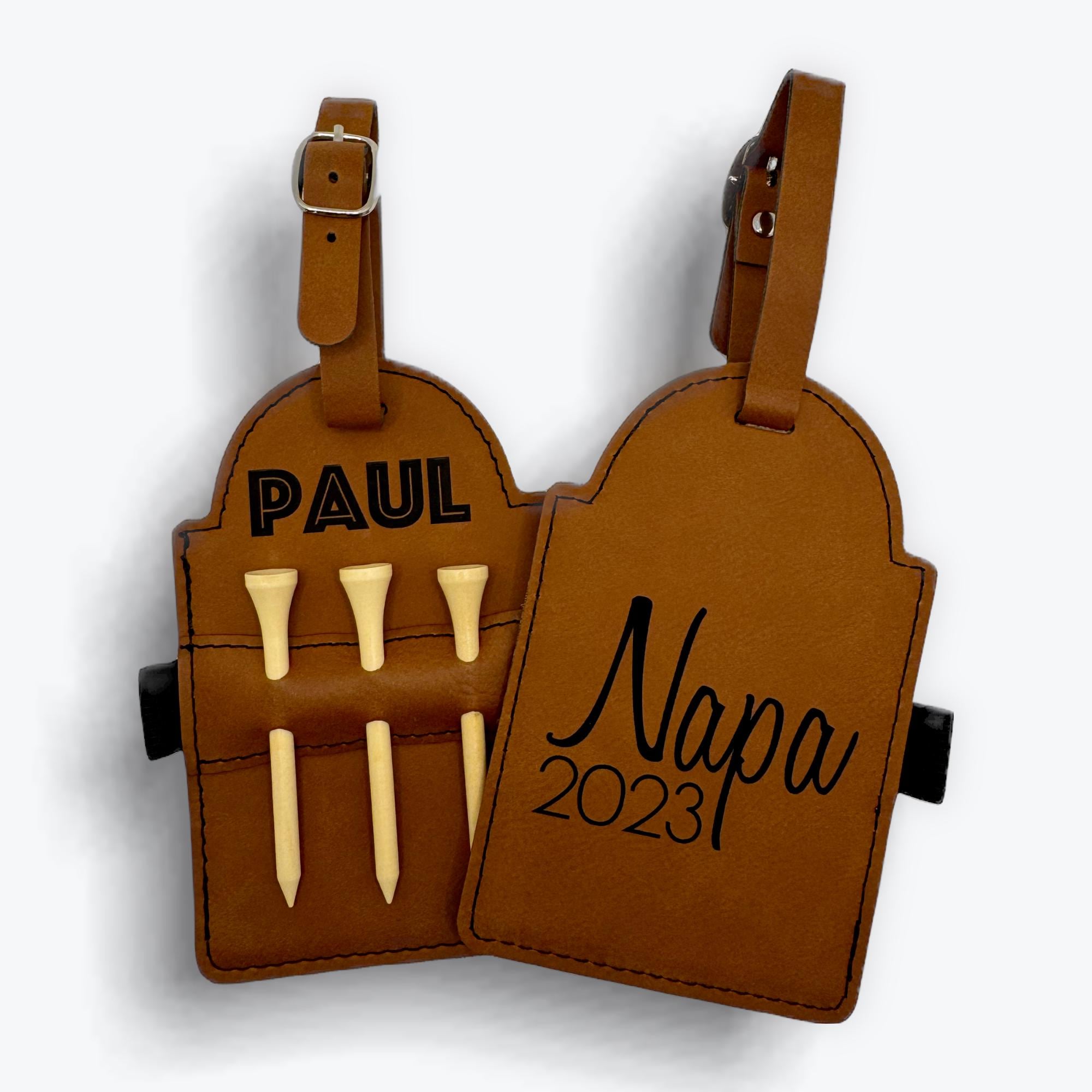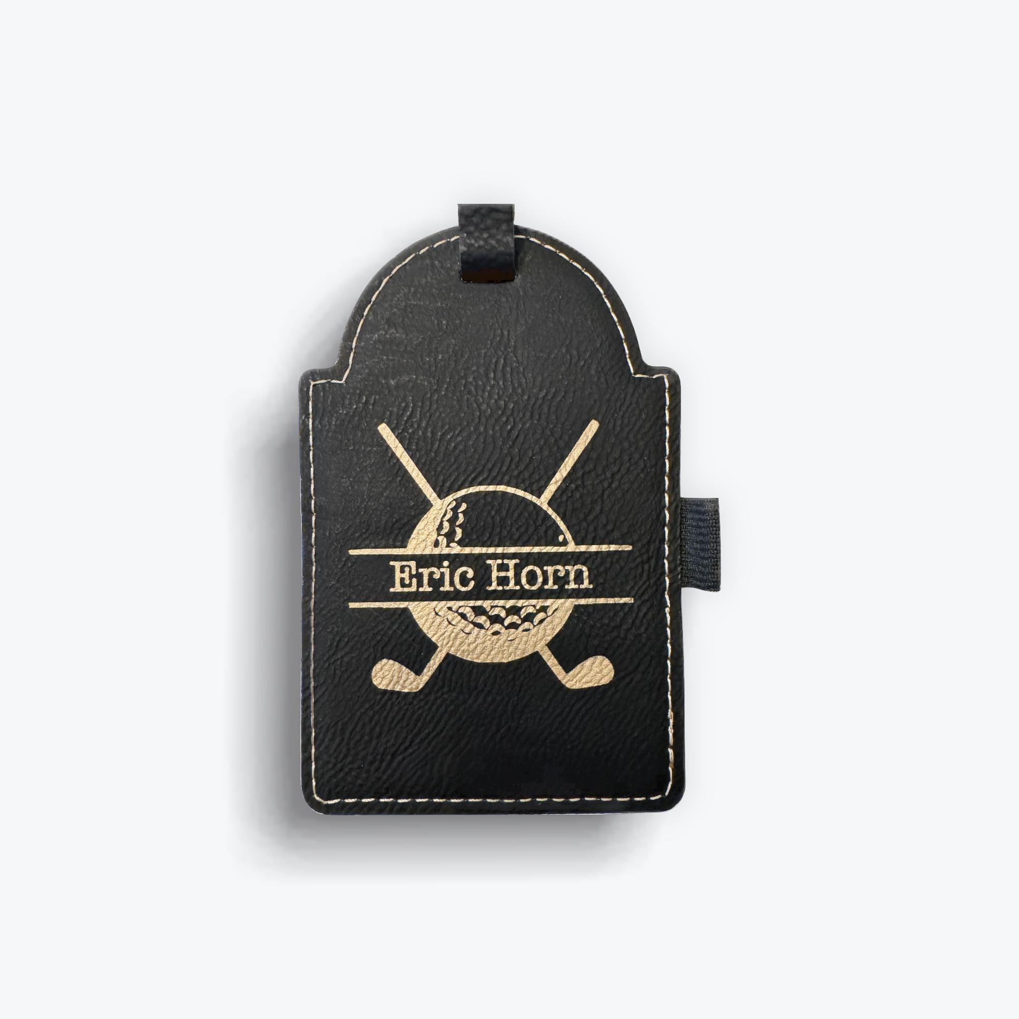 Give your golf bag a touch of class and personality with this custom engraved leather golf tag — complete with built-in golf tees and premium craftsmanship.
