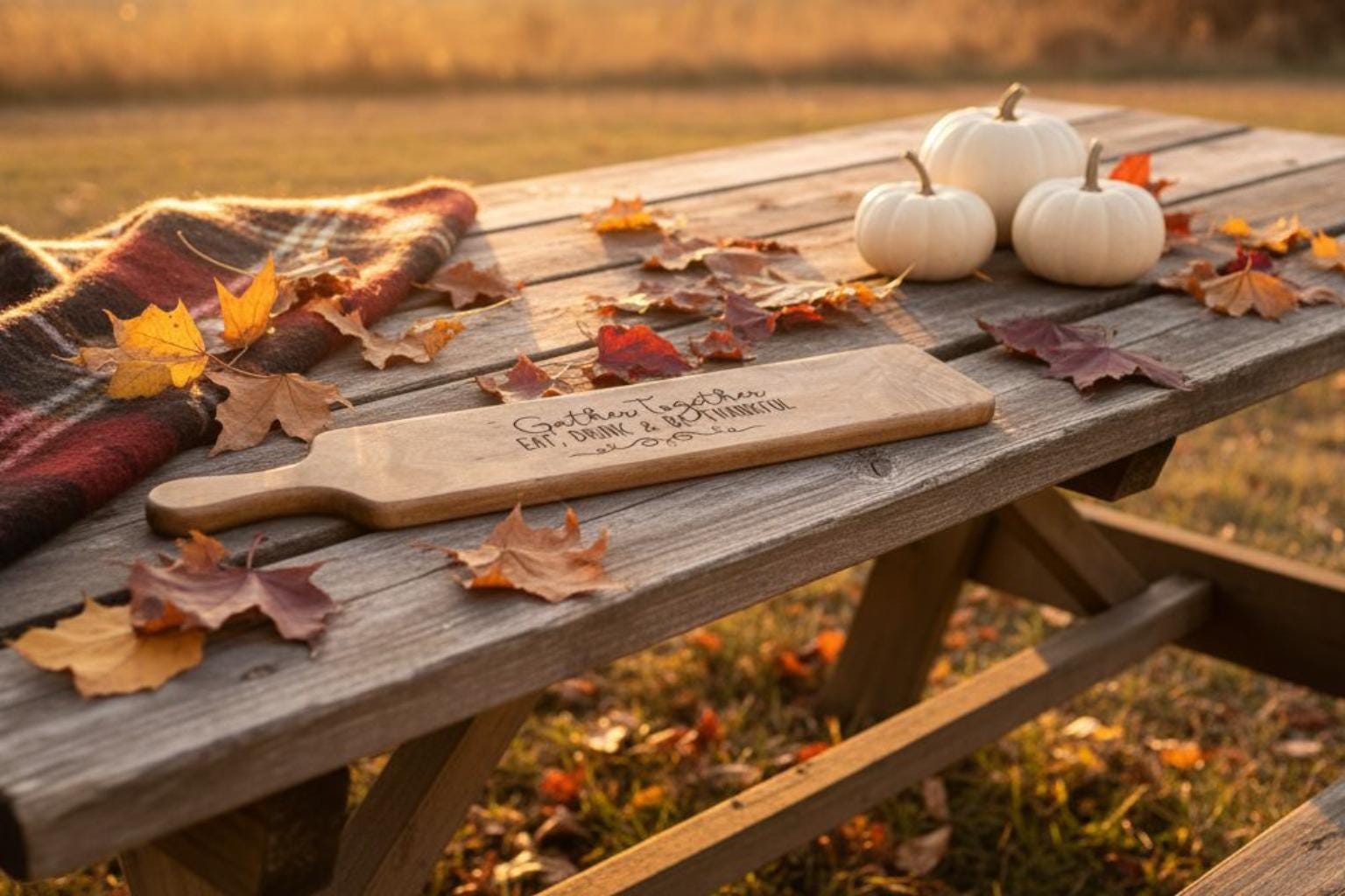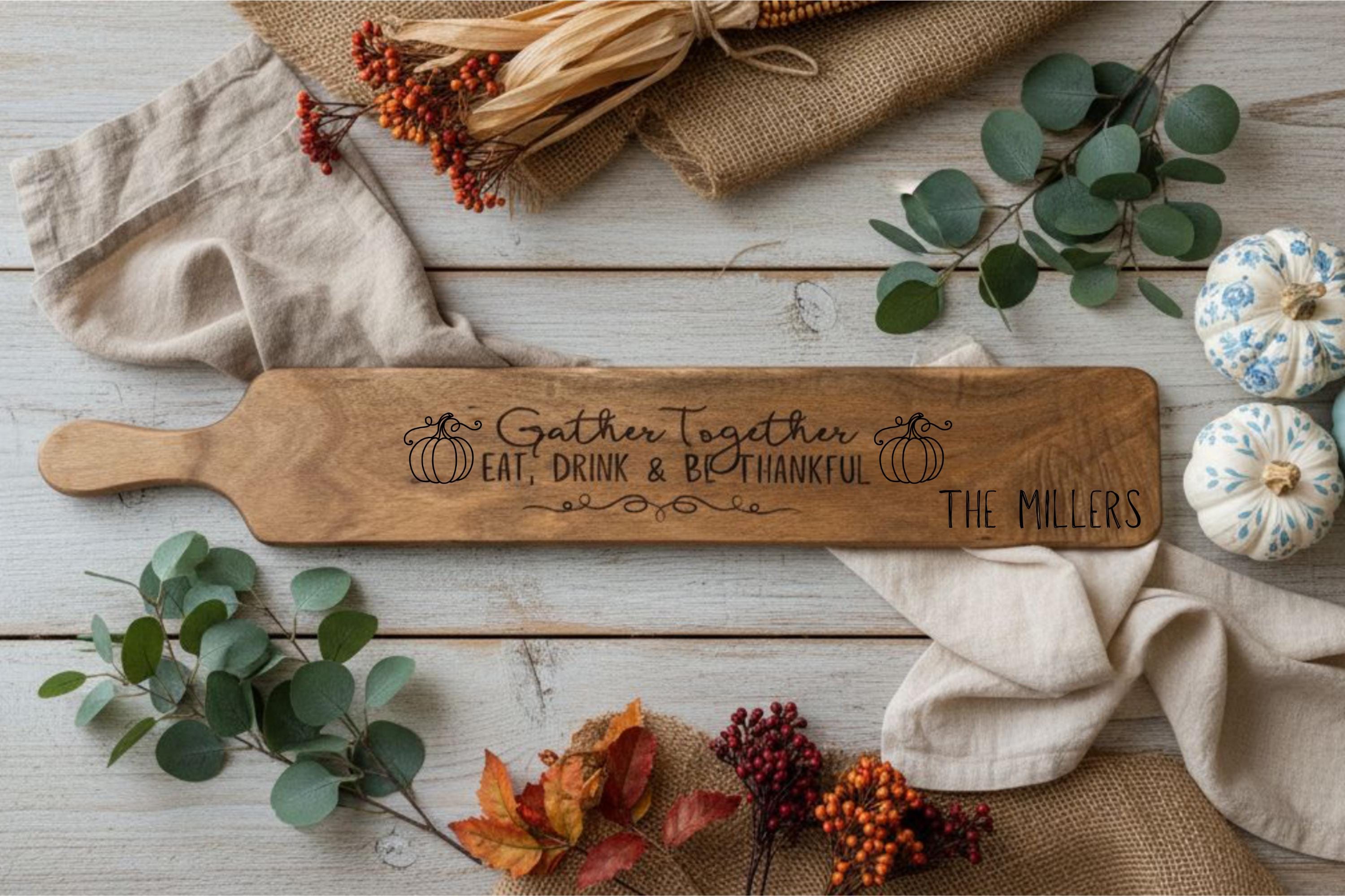 Featuring the heartfelt phrase “Gather Together, Eat, Drink, and Be Thankful,” this board adds a touch of warmth and charm to any holiday table. Perfect for serving your favorite cheeses, meats, fruits, and treats — or as a thoughtful personalized gift for friends and family.