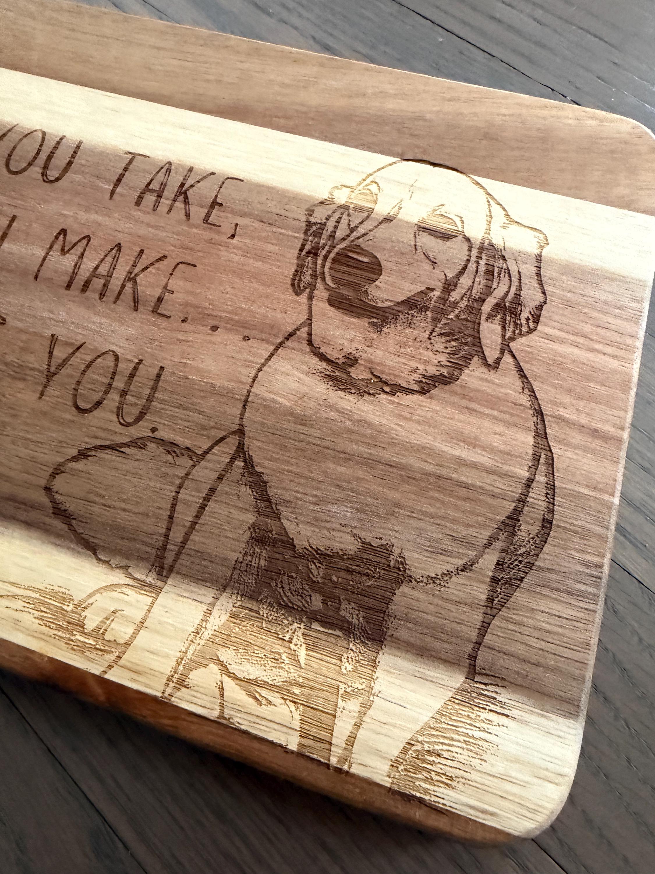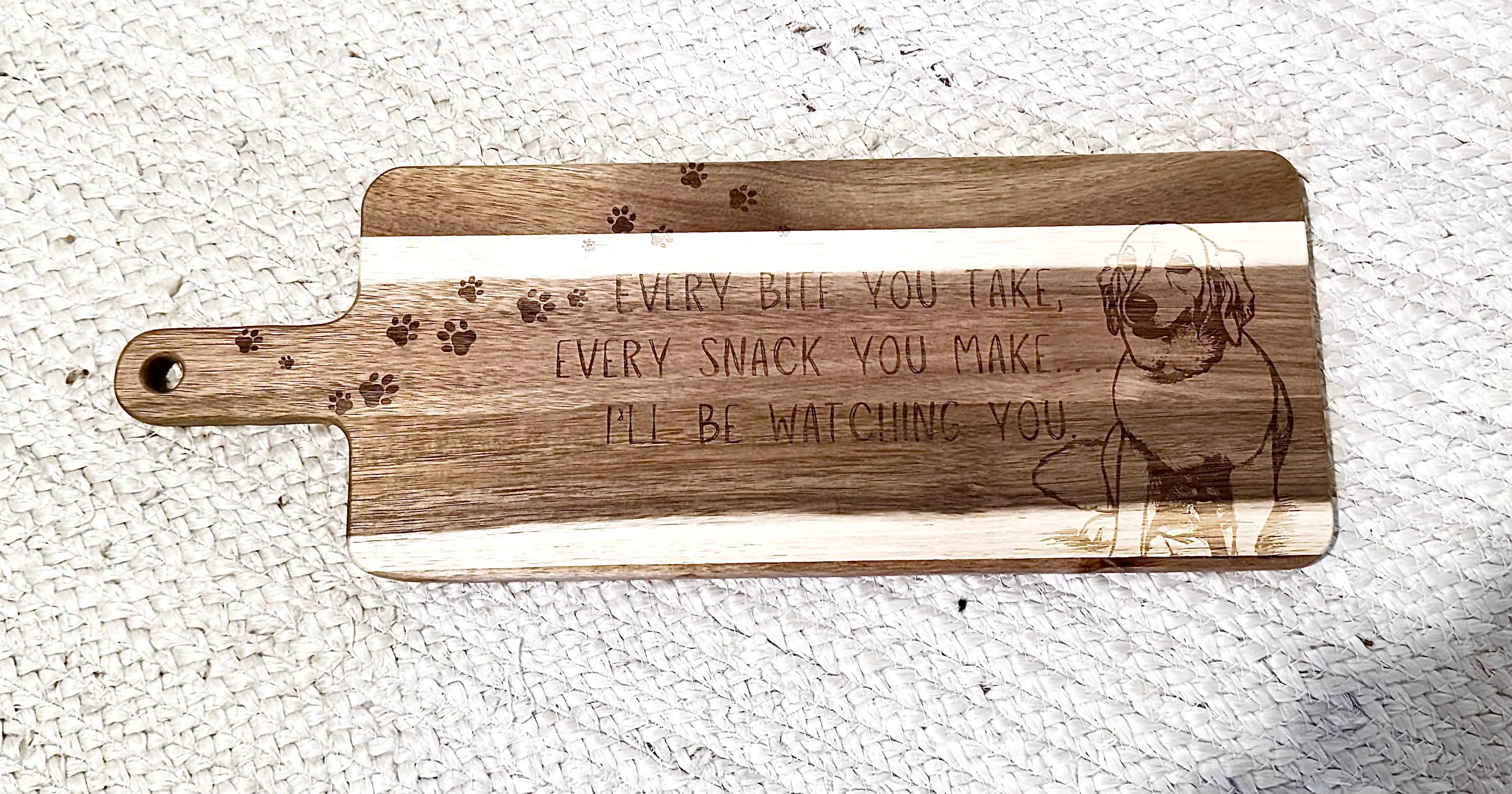 Each cutting board is custom engraved with your dog’s photo and the playful phrase: